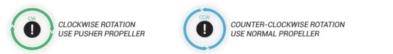 The diagrams above show two types of propellers: clockwise (called pushers) and counterclockwise (called pullers). The most reliable to recognize the correct propeller type by its shape as shown below. The thicker edge is the leading edge which moves in the direction of rotation. The trailing edge is more radical scalloped and usually thinner.