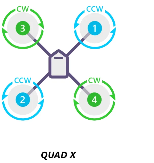 The diagrams below show motor order for each frame type. The numbers indicate which output pin from the autopilot shoould be connected to each motor/propeller. The propeller direction is shown in green (clockwise, CW) or blue (counter-clockwise, CCW)