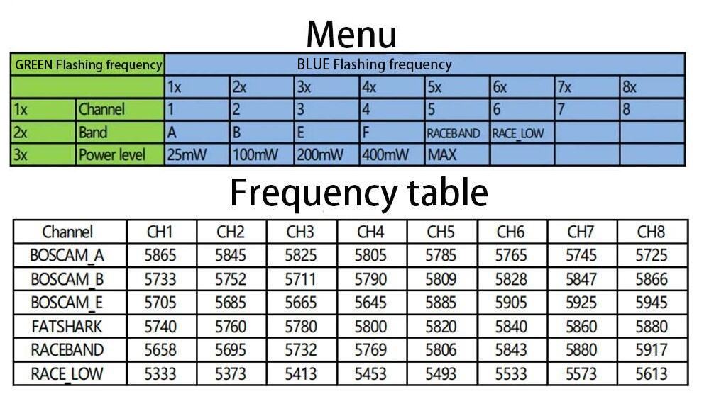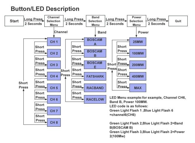 Short press to adjust channel (corresponding to blue light, 1-8, a total of 8 times) Long press for 2 seconds to adjust the group (corresponding to green light, A, B, E, F, R, a total of 5 times) Long Press for 5 seconds to adjust the power (corresponding to the red light, a total of 5 times) Long press for more than 10 seconds to open 11 prohibited USA channels. Default does not output prohibited USA channels: 5705,5685,5665,5885,5905,5880,5658,5695,5732,5880,5917