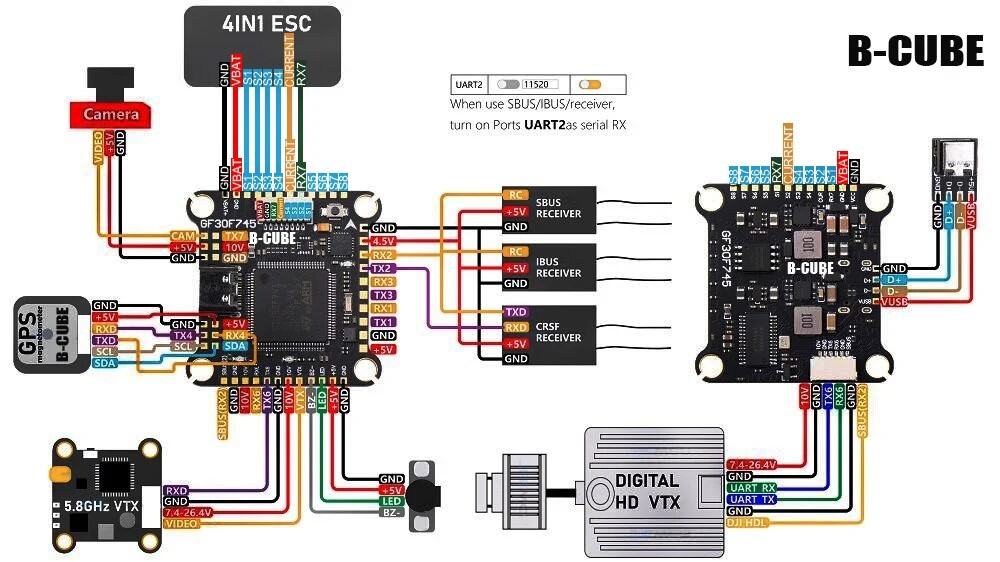 F745 V2 — это серьёзное обновление, предлагающее улучшенные характеристики и точность. Процессор обновлён с STM32F745VG до STM32F746VG, что повышает вычислительную мощность для более быстрого отклика и улучшенной стабильности полёта. Инерциальный измерительный блок (IMU) был обновлён с MPU6000 до ICM-42688-P, что обеспечивает меньший уровень шума, более высокую чувствительность и лучшую устойчивость к вибрации. Эти усовершенствования обеспечивают более точное управление полётом, превосходные характеристики гироскопа и большую надёжность. Разработанный для высокоскоростных FPV-приложений, V2 обеспечивает более плавный полёт, более быструю реакцию и исключительную управляемость в сложных условиях.