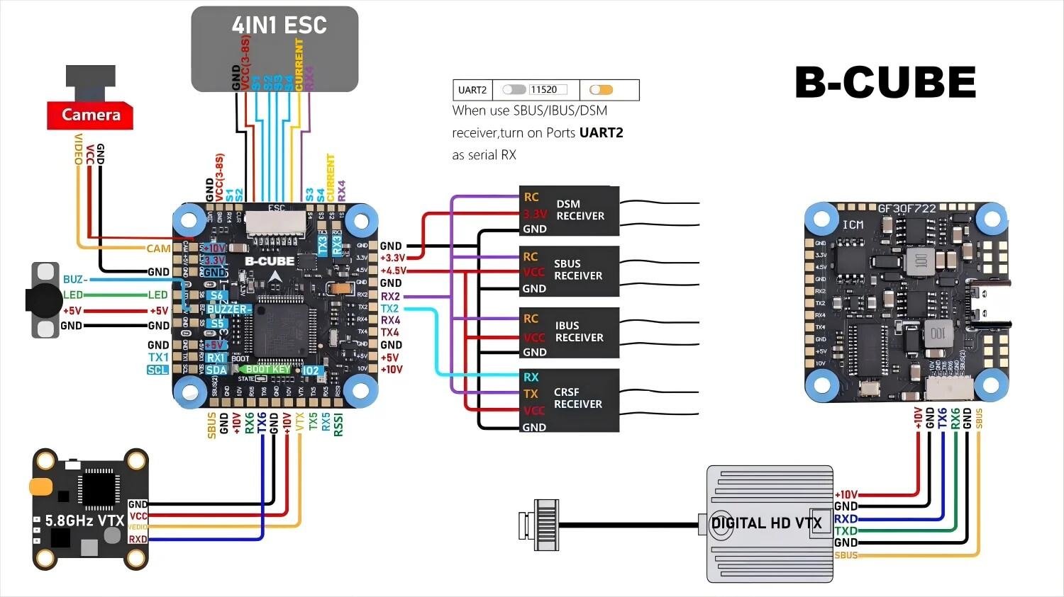 Благодаря процессору F4, встроенному экранному меню Betaflight, карте памяти MicroSD Black Box, 5v3a sbec и видеофильтру вы сможете настроить PIDS с помощью передатчика и в кратчайшие сроки вывести его на трассу!